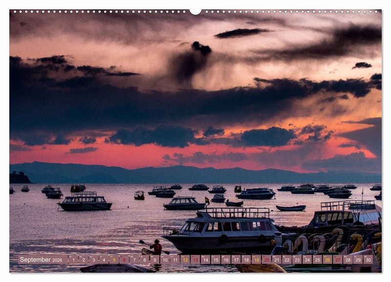Die Bolivianer lieben Farben. Kein Wunder, denn der liebe Gott muss über Bolivien all seine Farbtöpfe entleert haben. Der Kalender zeigt einzigartige Bilder von farbenfrohen Kleidern, bunten Märkten, farbenprächtige Lagunen, ja sogar kahle Berge präsentieren sich hier in schillernden Farben.