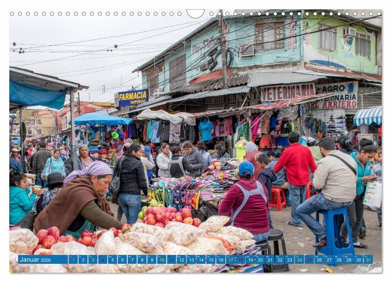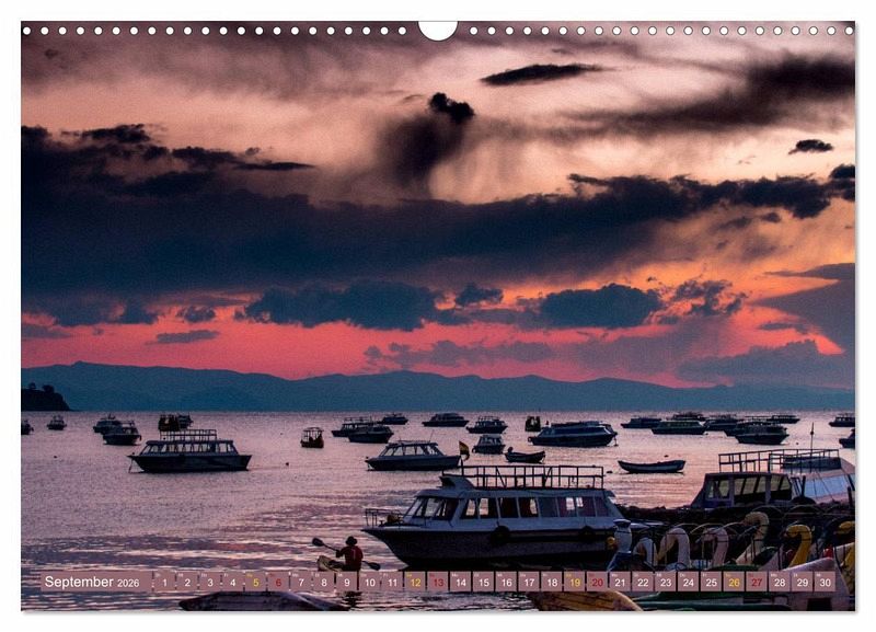 Die Bolivianer lieben Farben. Kein Wunder, denn der liebe Gott muss über Bolivien all seine Farbtöpfe entleert haben. Der Kalender zeigt einzigartige Bilder von farbenfrohen Kleidern, bunten Märkten, farbenprächtige Lagunen, ja sogar kahle Berge präsentieren sich hier in schillernden Farben.