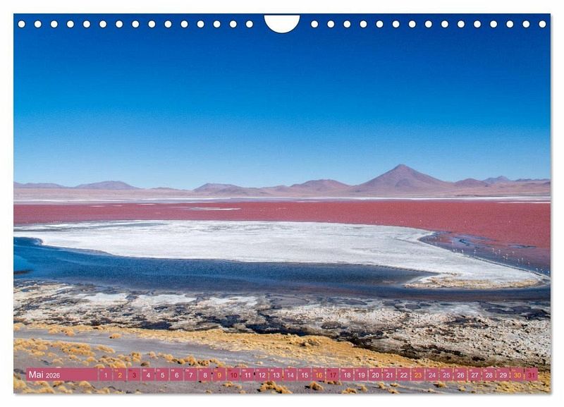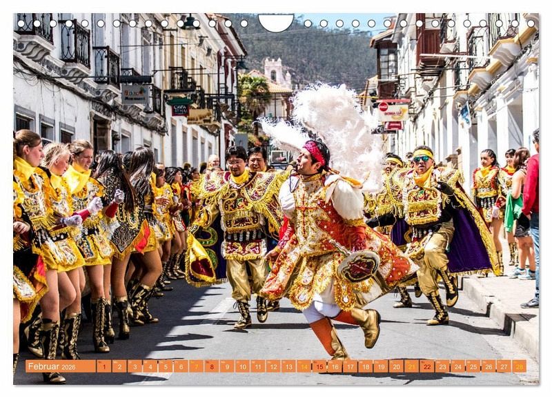 Die Bolivianer lieben Farben. Kein Wunder, denn der liebe Gott muss über Bolivien all seine Farbtöpfe entleert haben. Der Kalender zeigt einzigartige Bilder von farbenfrohen Kleidern, bunten Märkten, farbenprächtige Lagunen, ja sogar kahle Berge präsentieren sich hier in schillernden Farben.