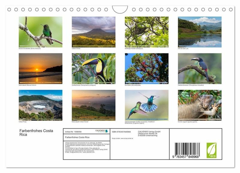 QUALITÄT - Hochwertiger Fotokalender mit 12 wunderschönen Motiven auf lichtbeständigem Bilderdruckpapier, robuste Spiralbindung mit Aufhängebügel.NACHHALTIG - deutliche Abfallreduzierung durch bedarfsgerechte Einzelstückfertigung, umweltfreundliches FSC-zertifiziertes Papier, Produktion in Deutschland, klimabewusste Logistik.PERFEKTES GESCHENK - Kalender für Freunde und Familie, für Kinder und Erwachsene, jung und alt, zu Weihnachten, Geburtstag oder zwischendurch.VIELFALT - Bildkalender in verschiedenen Formaten, z.B. DIN A5, DIN A4, DIN A3 sowie DIN A2. Ob Naturmotiv, Gemälde oder Fotos, ideal für ein persönliches Wohlfühlambiente.Erleben Sie faszinierende Aufnahmen aus Costa Rica! von Autor(in): Sonja Jordan