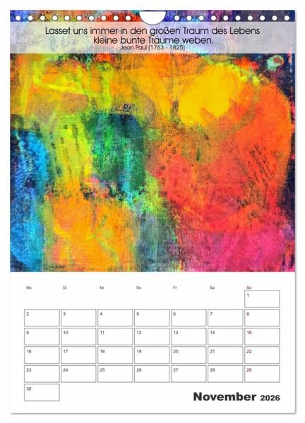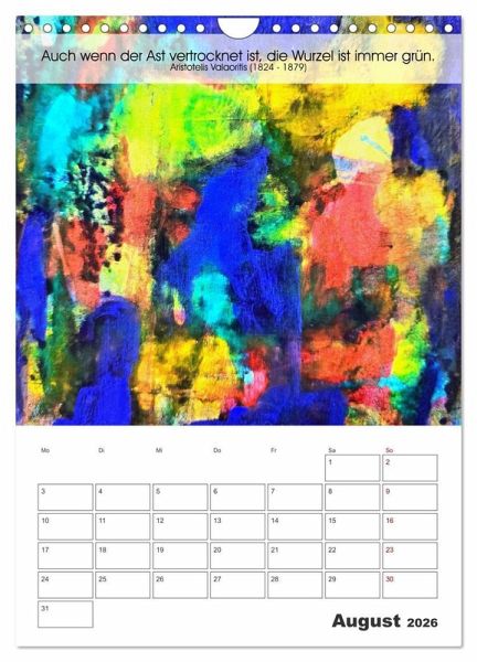 QUALITÄT - Hochwertiger Fotokalender mit 12 wunderschönen Motiven auf lichtbeständigem Bilderdruckpapier, robuste Spiralbindung mit Aufhängebügel.NACHHALTIG - deutliche Abfallreduzierung durch bedarfsgerechte Einzelstückfertigung, umweltfreundliches FSC-zertifiziertes Papier, Produktion in Deutschland, klimabewusste Logistik.PERFEKTES GESCHENK - Kalender für Freunde und Familie, für Kinder und Erwachsene, jung und alt, zu Weihnachten, Geburtstag oder zwischendurch.VIELFALT - Bildkalender in verschiedenen Formaten, z.B. DIN A5, DIN A4, DIN A3 sowie DIN A2. Ob Naturmotiv, Gemälde oder Fotos, ideal für ein persönliches Wohlfühlambiente.Abstrakte Malerei mit Gouache untermalt mit Zitaten zu den Farben von Autor(in): Michaela Spreider