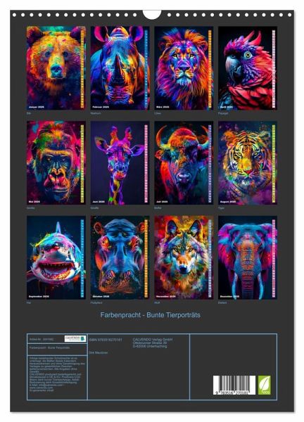 QUALITÄT - Hochwertiger Fotokalender mit 12 wunderschönen Motiven auf lichtbeständigem Bilderdruckpapier, robuste Spiralbindung mit Aufhängebügel.NACHHALTIG - deutliche Abfallreduzierung durch bedarfsgerechte Einzelstückfertigung, umweltfreundliches FSC-zertifiziertes Papier, Produktion in Deutschland, klimabewusste Logistik.PERFEKTES GESCHENK - Kalender für Freunde und Familie, für Kinder und Erwachsene, jung und alt, zu Weihnachten, Geburtstag oder zwischendurch.VIELFALT - Bildkalender in verschiedenen Formaten, z.B. DIN A5, DIN A4, DIN A3 sowie DIN A2. Ob Naturmotiv, Gemälde oder Fotos, ideal für ein persönliches Wohlfühlambiente.Entdecken Sie die lebendige Schönheit der Tierwelt mit unserem Kalender 'Farbenpracht - Bunte Tierporträts von Autor(in): Dirk Meutzner