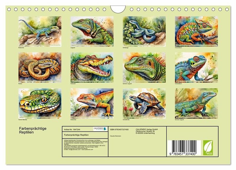 QUALITÄT - Hochwertiger Fotokalender mit 12 wunderschönen Motiven auf lichtbeständigem Bilderdruckpapier, robuste Spiralbindung mit Aufhängebügel.NACHHALTIG - deutliche Abfallreduzierung durch bedarfsgerechte Einzelstückfertigung, umweltfreundliches FSC-zertifiziertes Papier, Produktion in Deutschland, klimabewusste Logistik.PERFEKTES GESCHENK - Kalender für Freunde und Familie, für Kinder und Erwachsene, jung und alt, zu Weihnachten, Geburtstag oder zwischendurch.VIELFALT - Bildkalender in verschiedenen Formaten, z.B. DIN A5, DIN A4, DIN A3 sowie DIN A2. Ob Naturmotiv, Gemälde oder Fotos, ideal für ein persönliches Wohlfühlambiente.Zauberhafte Aquarelle - Krokodile, Chamäleon und Co. von Autor(in): Claudia Kleemann