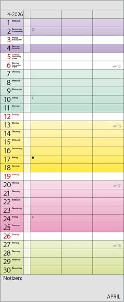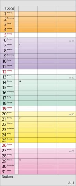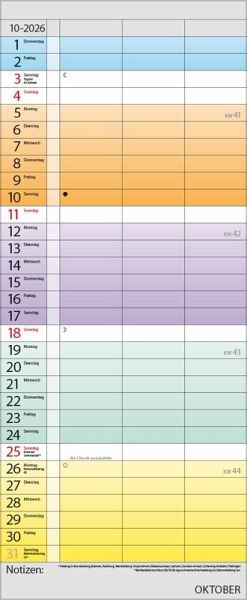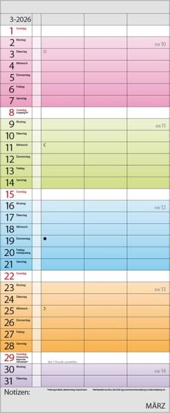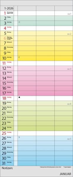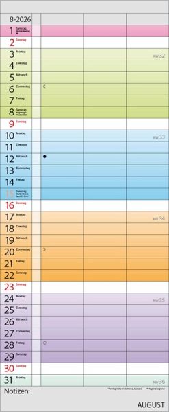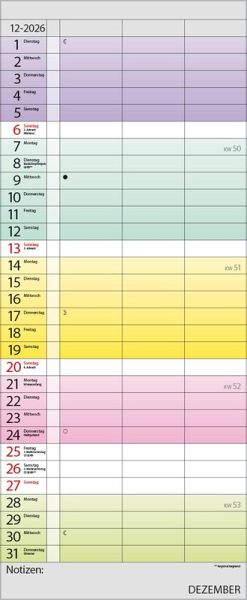 Übersichtlicher Familienplaner, 3 große Spalten; stabile Rückwand Wöchentlich wechselnde moderne Farben für einen guten Überblick; 19 x 46 cm Viel Platz für Eintragungen, ohne störende Bilder in den Spalten leichte Beschreibbarkeit, auch mit Bunt- und Bleistiften Deutsches Kalendarium mit regionalen Feiertagen für D, A und CH Farblich hervorgehobene Sonn- und Feiertage, Anzeige der Zeitumstellung Gedruckt auf dickem und umweltfreundlichem FSC Papier