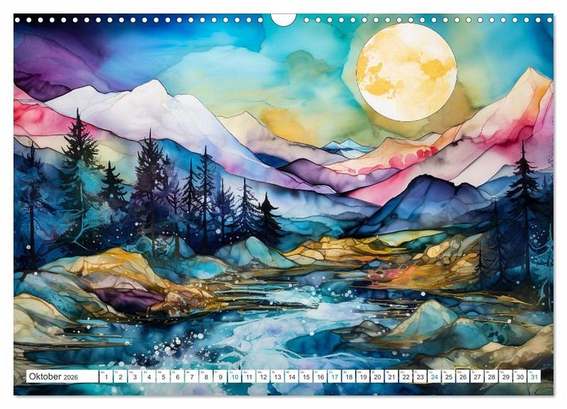 Tauchen Sie ein in die faszinierende Welt der Natur mit diesem exklusiven Kalender - einer meisterhaften Kollektion von Landschaften, die durch die einzigartige Alkohol- und Ink-Technik zum Leben erweckt wurden. Jeder Monat enthüllt traumhafte Szenarien, in denen Tinte und Alkohol sich zu einem wahren Kunstwerk vereinen.