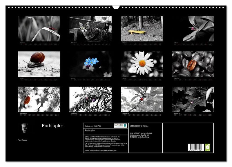 QUALITÄT - Hochwertiger Fotokalender mit 12 wunderschönen Motiven auf lichtbeständigem Bilderdruckpapier, robuste Spiralbindung mit Aufhängebügel.NACHHALTIG - deutliche Abfallreduzierung durch bedarfsgerechte Einzelstückfertigung, umweltfreundliches FSC-zertifiziertes Papier, Produktion in Deutschland, klimabewusste Logistik.PERFEKTES GESCHENK - Kalender für Freunde und Familie, für Kinder und Erwachsene, jung und alt, zu Weihnachten, Geburtstag oder zwischendurch.VIELFALT - Bildkalender in verschiedenen Formaten, z.B. DIN A5, DIN A4, DIN A3 sowie DIN A2. Ob Naturmotiv, Gemälde oder Fotos, ideal für ein persönliches Wohlfühlambiente.Die schönsten Farbtupfer in einer Schwarz Weißen Welt von Autor(in): Paul Gorski
