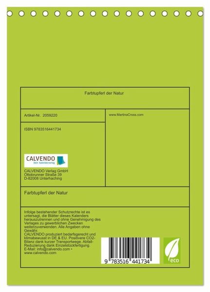 QUALITÄT - Hochwertiger Fotokalender mit 12 wunderschönen Motiven auf lichtbeständigem Bilderdruckpapier, robuste Spiralbindung.NACHHALTIG - deutliche Abfallreduzierung durch bedarfsgerechte Einzelstückfertigung, umweltfreundliches FSC-zertifiziertes Papier, Produktion in Deutschland, klimabewusste Logistik.PERFEKTES GESCHENK - Kalender für Freunde und Familie, für Kinder und Erwachsene, jung und alt, zu Weihnachten, Geburtstag oder zwischendurch.VIELFALT - Bildkalender in verschiedenen Formaten, z.B. DIN A5, DIN A4, DIN A3 sowie DIN A2. Ob Naturmotiv, Gemälde oder Fotos, ideal für ein persönliches Wohlfühlambiente.24 wunderbare Farbtupferl der Natur von Autor(in): Martina Cross