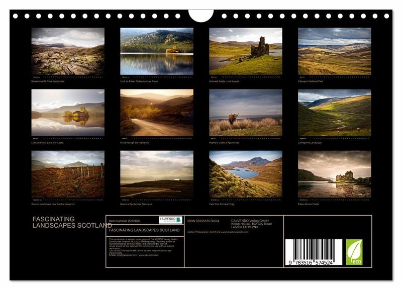 QUALITY - High-quality photo calendar with 12 beautiful images on light-resistant paper, robust spiral binding with hanger.SUSTAINABLE - Significant waste reduction due to print-on-demand production, environmentally friendly FSC-certified paper, produced in the UK, climate-conscious logistical processes.PERFECT GIFT - calendars for friends and family, for children, all ages and all occasions, from Christmas to birthdays and everything in between.LOTS OF CHOICE - Wall calendars in different sizes (DIN A4 and DIN A3), for any topic and personal taste, featuring photography, painting and illustrations.Beautiful Images of Scotland's inspiring Landscape, author: Dorit Fuhg