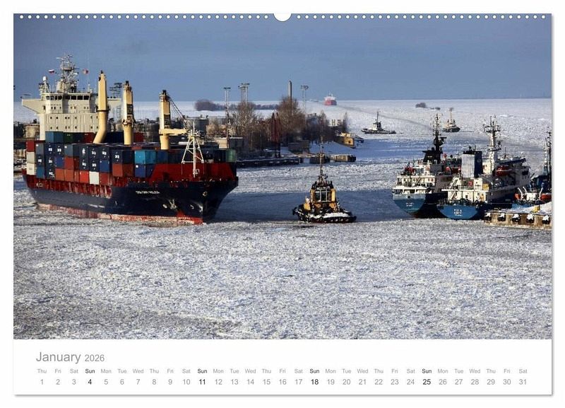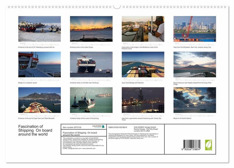 With this calendar in your hands you can feel the fascination of worldwide shipping. Travel through the Panama Canal and the Suez Canal, across high seas to New York as well as to Asia or to the wintery port of St. Petersburg on board a container ship or gas tanker.