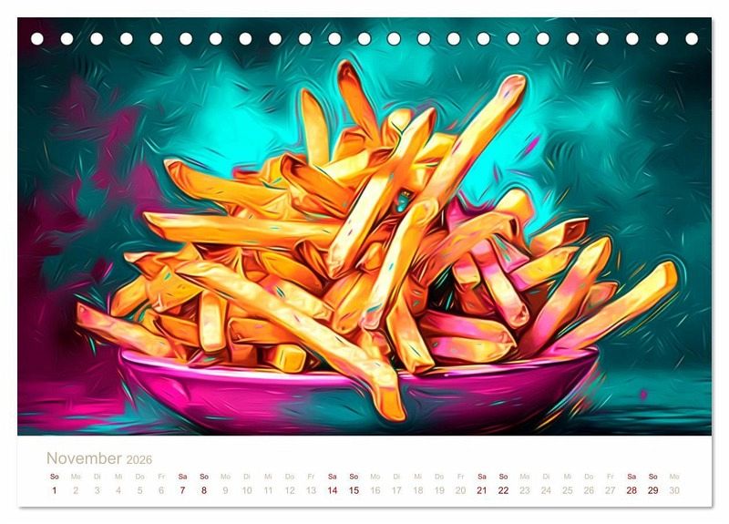 Unsere Wandkalender mit KI-generierten Bildern zeigen atemberaubende Bilder von leckerem Fast Food. Jedes Bild ist sorgfältig ausgewählt und bearbeitet, um die Schönheit und Einzigartigkeit jedes Essens zu betonen und Ihnen einen Eindruck von ihrem möglichen Essen zu geben.