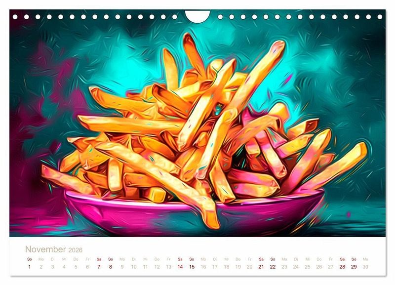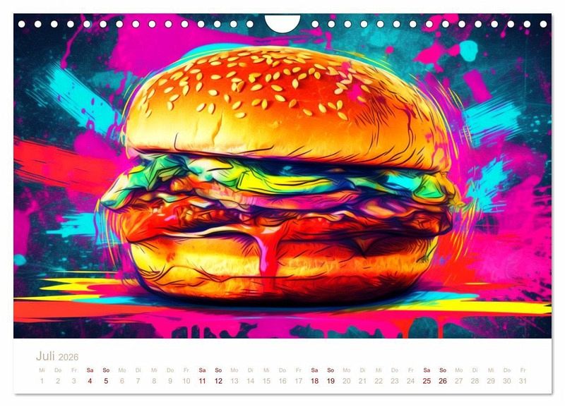 Unsere Wandkalender mit KI-generierten Bildern zeigen atemberaubende Bilder von leckerem Fast Food. Jedes Bild ist sorgfältig ausgewählt und bearbeitet, um die Schönheit und Einzigartigkeit jedes Essens zu betonen und Ihnen einen Eindruck von ihrem möglichen Essen zu geben.