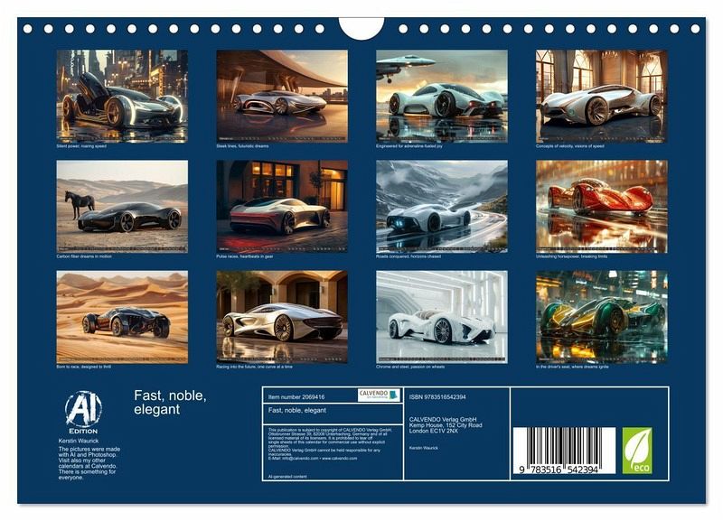 This calendar presents a fascinating fusion of elegant cars in organic shapes, combined with beautiful women and confident men. Each month becomes a unique work of art to dream, combining the fascination for modern automotive technology and the elegance of female beauty in a harmonious composition. Enjoy the ideas brought by artificial intelligence to show how it imagines noble vehicles.