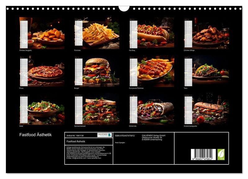 Willkommen zu einer kulinarischen Reise der Extraklasse! Unser "Fastfood Ästhetik" Kalender vereint den vertrauten Genuss von Fastfood mit der anspruchsvollen Ästhetik hochwertiger Foodfotografie. Jeder Monat präsentiert ein KI generirtes visuelles Fest für die Sinne, indem er die unwiderstehlichen Details und die kunstvolle Präsentation von Fastfood-Gerichten auf eine völlig neue Ebene hebt.