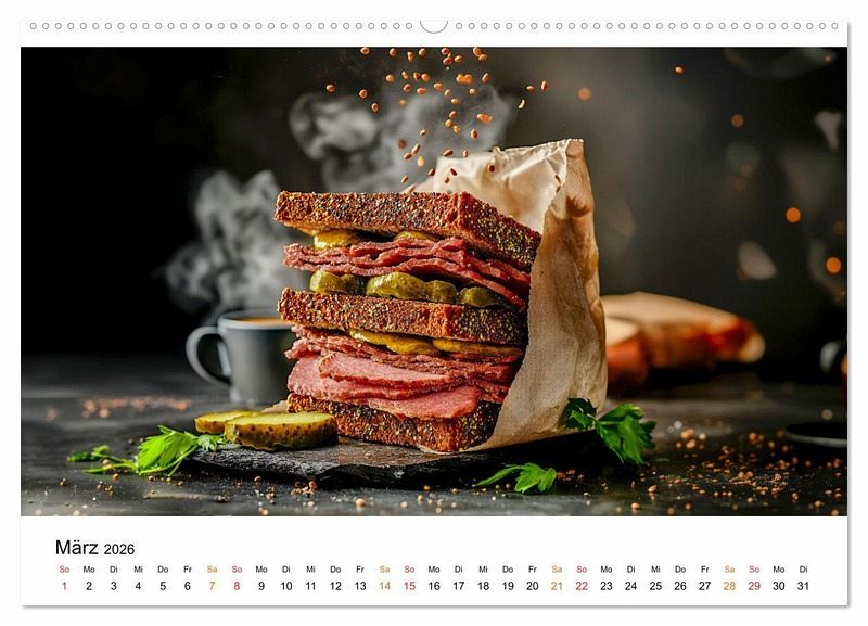 März: Pastrami-Sandwich - dünne Pastrami-Scheiben auf Roggenbrot mit würzigem Senfaufstrich und eingelegten Gurkenscheiben
