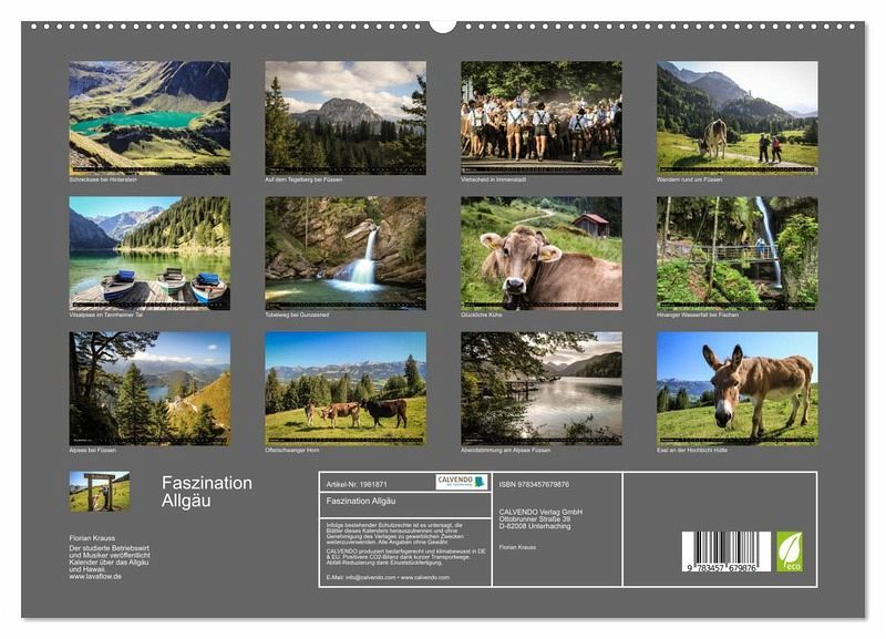 PREMIUM-LINIE - Brillanter Fotokalender mit 12 wunderschönen Motiven, Kunstdruck in Hochglanz in Museumsqualität.QUALITÄT - edle Materialien, stabile Rückwand mit 2 innovativen Einstecktaschen für eine optimale Präsentation an der Wand.NACHHALTIG - deutliche Abfallreduzierung durch bedarfsgerechte Einzelstückfertigung, umweltfreundliches FSC-zertifiziertes Papier, Produktion in Deutschland, klimabewusste Logistik.PERFEKTES GESCHENK - Kalender für Freunde und Familie, für Kinder und Erwachsene, jung und alt, zu Weihnachten, Geburtstag oder zwischendurch.Berge, Seen, unberührte Natur und jede Menge Kühe. Das ist das Allgäu. Perle im Süden. von Autor(in): Florian Krauss