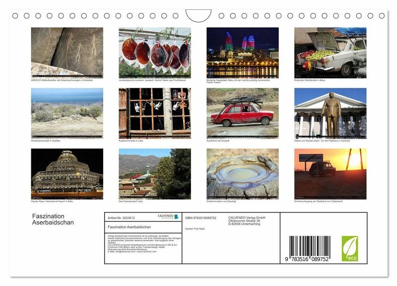 Die ehemalige sowjetische Teilrepublik Aserbaidschan ist mit ihren Sehenswürdigkeiten und Besonderheiten nur wenigen bekannt. Da ist auf der einen Seite die moderne Millionenmetropole Baku, da sind auf der anderen Seite Dörfer und Städte im Kaukasus, in denen die Zeit still zu stehen scheint. Hinzu kommen Naturphänomene wie die gut 500 Schlammvulkane des Landes oder die 10.000 Jahre alten Felszeichnungen von Gobustan, die zum Weltkulturerbe der UNESCO gehören. Der Journalist und Fotograf Karsten-Thilo Raab hat sein ganz persönliches Bild von dem faszinierenden Land am Kaspischen Meer, durch das dereinst die legendäre Seidenstraße verlief, mit der Kamera festgehalten. Einige der schönsten Impressionen fanden Eingang in diesen Kalender