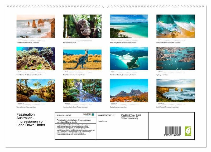 PREMIUM-LINIE - Brillanter Fotokalender mit 12 wunderschönen Motiven, Kunstdruck in Hochglanz in Museumsqualität.QUALITÄT - edle Materialien, stabile Rückwand mit 2 innovativen Einstecktaschen für eine optimale Präsentation an der Wand.NACHHALTIG - deutliche Abfallreduzierung durch bedarfsgerechte Einzelstückfertigung, umweltfreundliches FSC-zertifiziertes Papier, Produktion in Deutschland, klimabewusste Logistik.PERFEKTES GESCHENK - Kalender für Freunde und Familie, für Kinder und Erwachsene, jung und alt, zu Weihnachten, Geburtstag oder zwischendurch.The Land Down Under von Autor(in): Happy Monkey