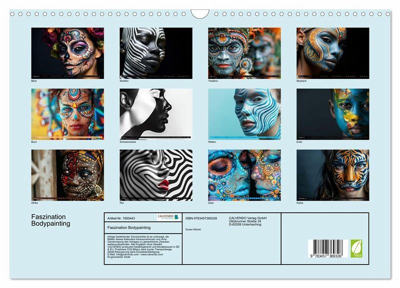 Willkommen in der Welt der lebendigen Kunstwerke! Bodypainting ist mehr als nur Farbe auf Haut - es ist eine einzigartige Ausdrucksform, die Körper und Kunst in einem faszinierenden Zusammenspiel vereint. Tauchen Sie ein in eine Welt, in der die Grenzen zwischen Kunst und Körper verschwimmen und atemberaubende Kreationen entstehen. Dieser Kalender wurde mit Unterstützung der KI erstellt.