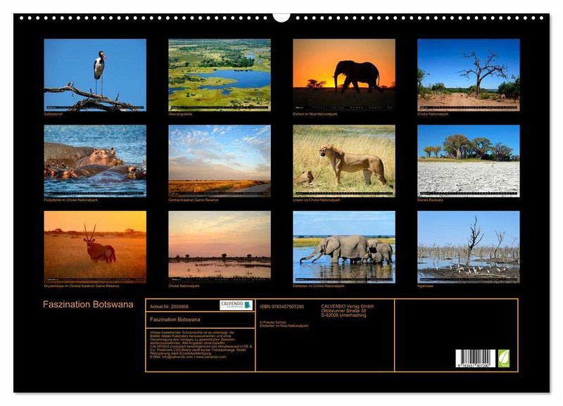 Kommen Sie mit in die Schönheit von Botswana mit ihren Tieren und der herrlichen Natur. Erfreuen Sie sich an wunderschönen afrikanischen Sonnenuntergängen. Jeder Monat zeigt Ihnen eine andere Seite des herrlichen Landes.