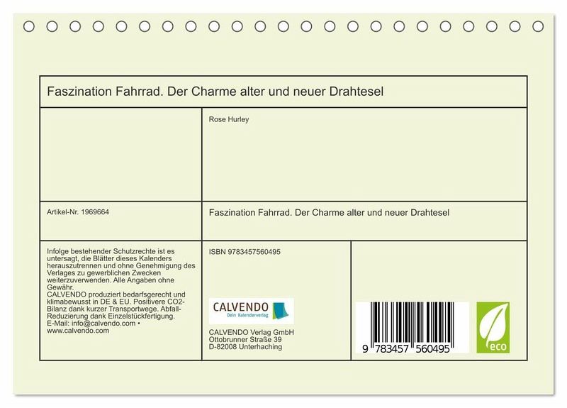QUALITÄT - Hochwertiger Fotokalender mit 12 wunderschönen Motiven auf lichtbeständigem Bilderdruckpapier, robuste Spiralbindung.NACHHALTIG - deutliche Abfallreduzierung durch bedarfsgerechte Einzelstückfertigung, umweltfreundliches FSC-zertifiziertes Papier, Produktion in Deutschland, klimabewusste Logistik.PERFEKTES GESCHENK - Kalender für Freunde und Familie, für Kinder und Erwachsene, jung und alt, zu Weihnachten, Geburtstag oder zwischendurch.VIELFALT - Bildkalender in verschiedenen Formaten, z.B. DIN A5, DIN A4, DIN A3 sowie DIN A2. Ob Naturmotiv, Gemälde oder Fotos, ideal für ein persönliches Wohlfühlambiente.Das beliebte und praktische Fortbewegungsmittel für Umwelt und Freiheit! von Autor(in): Rose Hurley