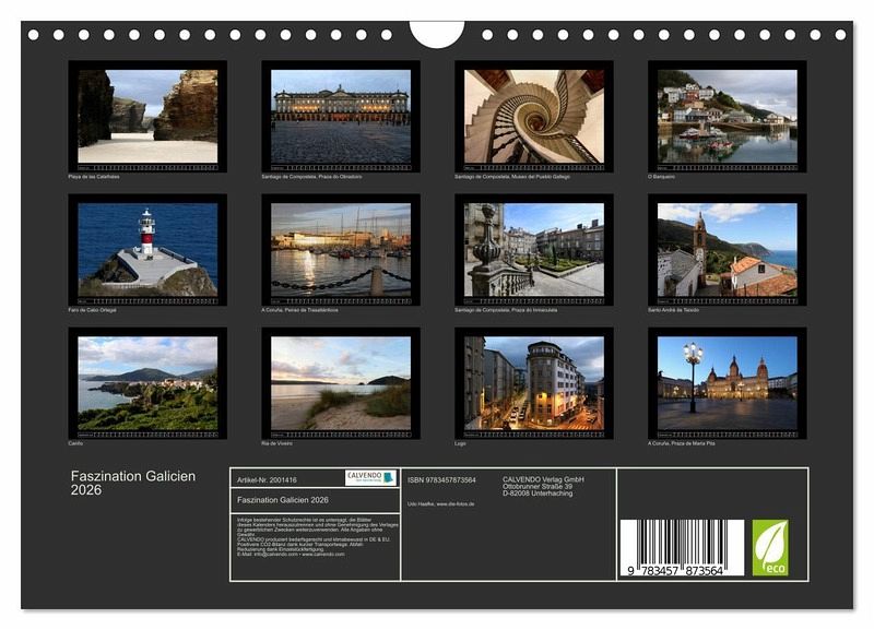 Galicien ist eine zauberhafte Melange aus spanischer Lebensart, atlantischen Küstenformationen, die an Irland erinnern, weitläufigen Wäldern und netten, lebhaften Städten. Nicht allein Santiago de Compostela als magisches Pilgerziel am Ende des Jakobsweges gehört zu sehenswerten Höhepunkten wie dieser Kalender zeigt.