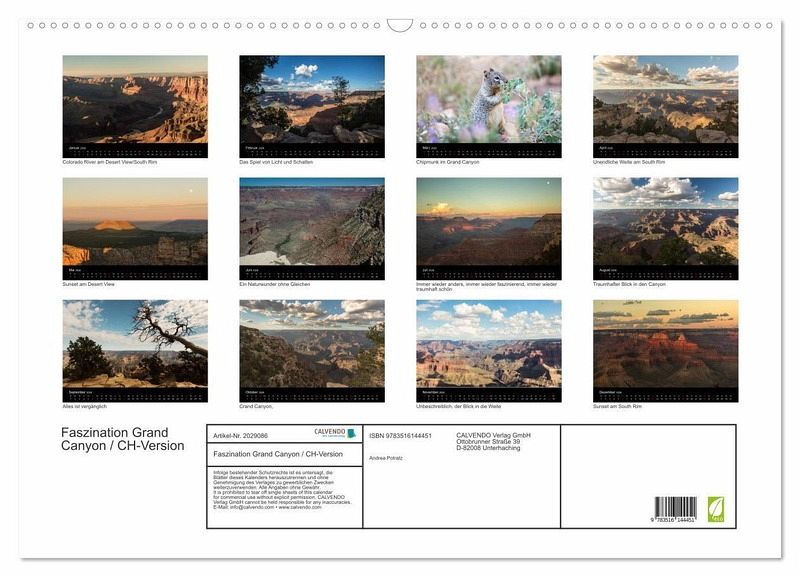 QUALITÄT - Hochwertiger Fotokalender mit 12 wunderschönen Motiven auf lichtbeständigem Bilderdruckpapier, robuste Spiralbindung mit Aufhängebügel.NACHHALTIG - deutliche Abfallreduzierung durch bedarfsgerechte Einzelstückfertigung, umweltfreundliches FSC-zertifiziertes Papier, Produktion in Deutschland, klimabewusste Logistik.PERFEKTES GESCHENK - Kalender für Freunde und Familie, für Kinder und Erwachsene, jung und alt, zu Weihnachten, Geburtstag oder zwischendurch.VIELFALT - Bildkalender in verschiedenen Formaten, z.B. DIN A5, DIN A4, DIN A3 sowie DIN A2. Ob Naturmotiv, Gemälde oder Fotos, ideal für ein persönliches Wohlfühlambiente.Ein unbeschreiblicher Anblick, wenn man am Rand des Canyon steht von Autor(in): Andrea Potratz.