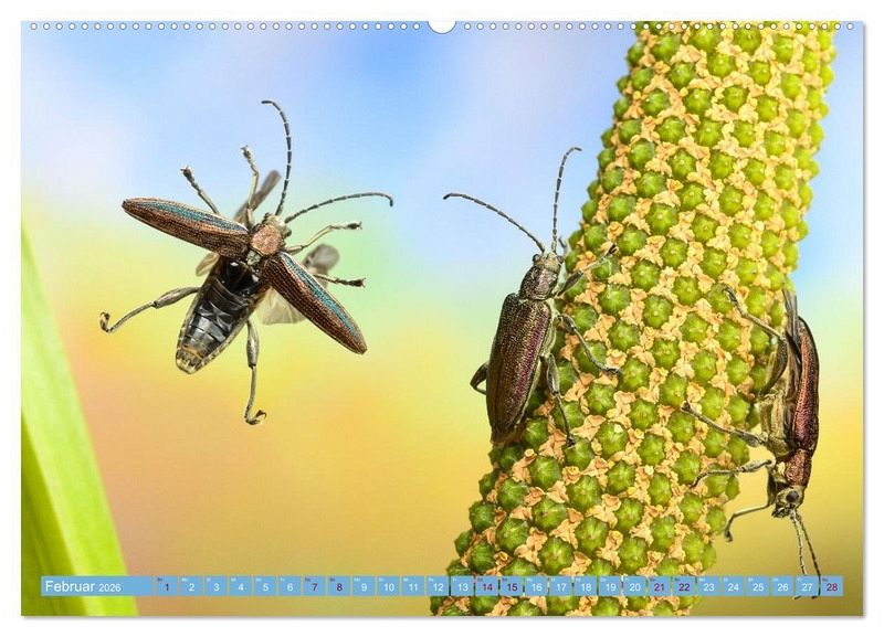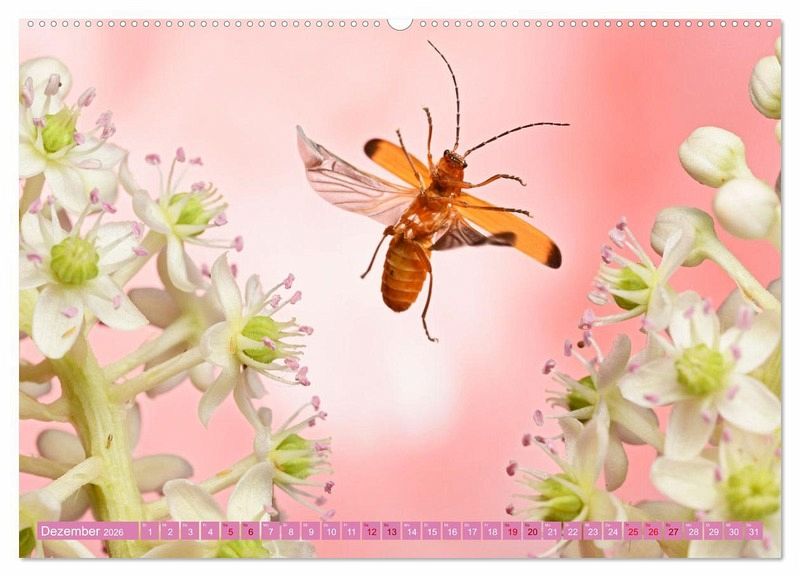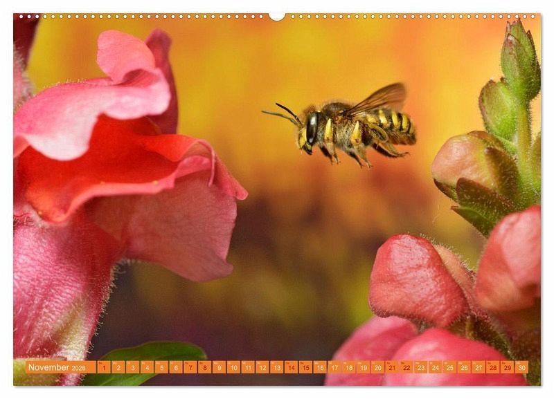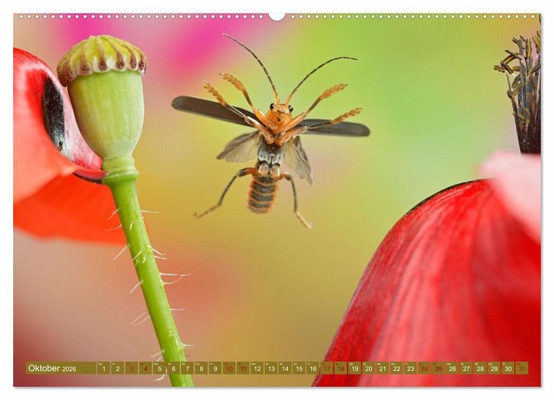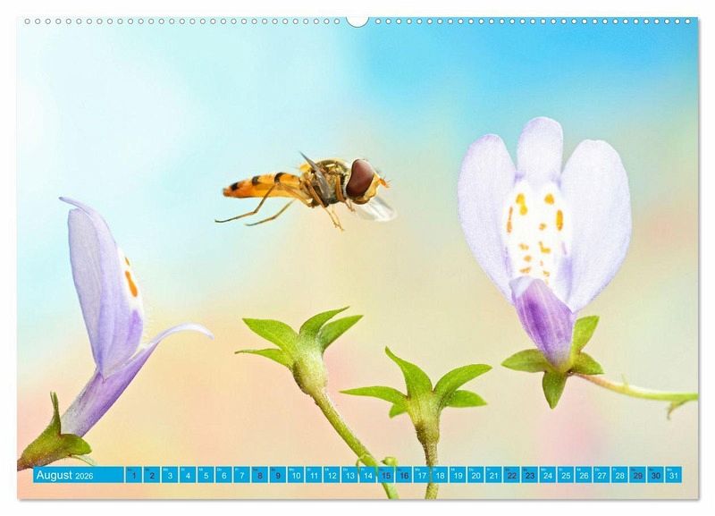 Der Kalender offenbart einen kurzen Moment im Leben der Insekten, die sich im Flug befinden und vom menschlichen Auge kaum erfasst werden kann. In farbenfrohen Aufnahmen lässt er den Betrachter teilhaben an diesem kleinen Naturwunder, das sich täglich in unseren Gärten abspielt.