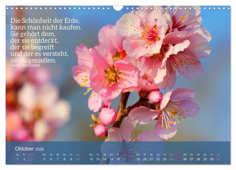 Zitate namhafter Schriftsteller und Philosophen, Weisheiten, die das Herz erfreuen, unterstreichen die zauberhaften Naturfotografien der Mandelblüte an der Weinstraße. Ein ideales Geschenk zum Jahresstart, Geburtstag, oder als Motivationsschub für die kleinen und großen Herausforderungen des Lebens und um die Schönheit der Natur zu entdecken. Schon im März erstrahlen die üppigen Blüten der Mandelbäume in zarten und kräftigen Rosatönen. Dieses jährliche Naturschauspiel wird mit den "Pfälzer Mandelwochen" efeiert und zieht zahlreiche Besucher magisch an sich daran zu erfreuen.