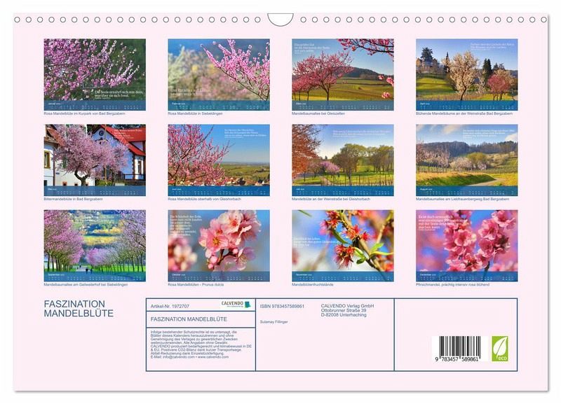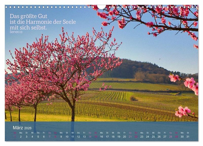 QUALITÄT - Hochwertiger Fotokalender mit 12 wunderschönen Motiven auf lichtbeständigem Bilderdruckpapier, robuste Spiralbindung mit Aufhängebügel.NACHHALTIG - deutliche Abfallreduzierung durch bedarfsgerechte Einzelstückfertigung, umweltfreundliches FSC-zertifiziertes Papier, Produktion in Deutschland, klimabewusste Logistik.PERFEKTES GESCHENK - Kalender für Freunde und Familie, für Kinder und Erwachsene, jung und alt, zu Weihnachten, Geburtstag oder zwischendurch.VIELFALT - Bildkalender in verschiedenen Formaten, z.B. DIN A5, DIN A4, DIN A3 sowie DIN A2. Ob Naturmotiv, Gemälde oder Fotos, ideal für ein persönliches Wohlfühlambiente.Mandelblüte an der Südlichen Weinstraße mit Zitaten von Autor(in): Sulamay Fillinger Fotografie