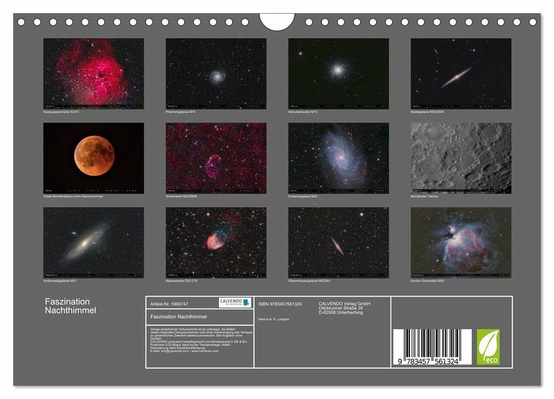 QUALITÄT - Hochwertiger Fotokalender mit 12 wunderschönen Motiven auf lichtbeständigem Bilderdruckpapier, robuste Spiralbindung mit Aufhängebügel.NACHHALTIG - deutliche Abfallreduzierung durch bedarfsgerechte Einzelstückfertigung, umweltfreundliches FSC-zertifiziertes Papier, Produktion in Deutschland, klimabewusste Logistik.PERFEKTES GESCHENK - Kalender für Freunde und Familie, für Kinder und Erwachsene, jung und alt, zu Weihnachten, Geburtstag oder zwischendurch.VIELFALT - Bildkalender in verschiedenen Formaten, z.B. DIN A5, DIN A4, DIN A3 sowie DIN A2. Ob Naturmotiv, Gemälde oder Fotos, ideal für ein persönliches Wohlfühlambiente.Astrofotografie von Markus Langlotz von Autor(in): Markus A. R. Langlotz