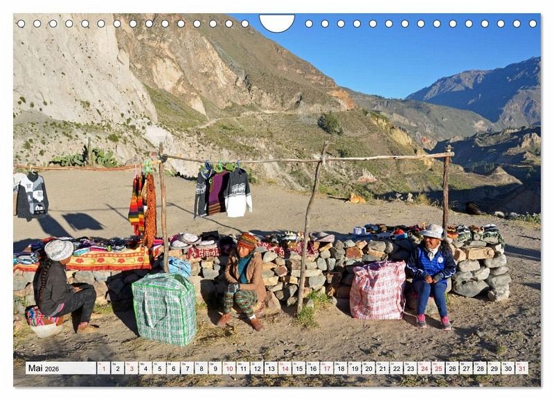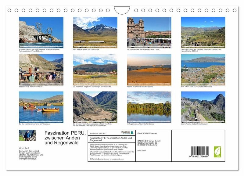 Nicht nur ungemein vielfältige Landschaftsformationen, vom Hochgebirge der Anden über Wüstengebiete und zerklüftete Küstenformationen bis hin zum tropischen Regenwald, aber auch eine große Geschichte, gepaart mit bedeutenden Baudenkmälern und freundlichen Menschen, prägen dieses südamerikanische Land. Der Autor besuchte den südlichen Teil von Peru, wanderte dabei vier Tage auf dem berühmten Inka-Trail bis Machu Picchu und präsentiert im Kalender einige seiner beeindruckenden Fotos.