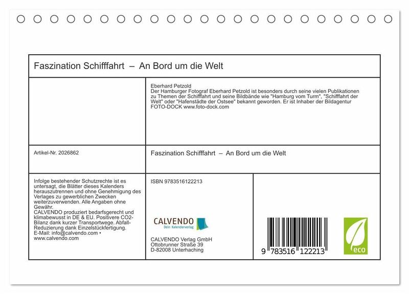 QUALITÄT - Hochwertiger Fotokalender mit 12 wunderschönen Motiven auf lichtbeständigem Bilderdruckpapier, robuste Spiralbindung.NACHHALTIG - deutliche Abfallreduzierung durch bedarfsgerechte Einzelstückfertigung, umweltfreundliches FSC-zertifiziertes Papier, Produktion in Deutschland, klimabewusste Logistik.PERFEKTES GESCHENK- Kalender für Freunde und Familie, für Kinder und Erwachsene, jung und alt, zu Weihnachten, Geburtstag oder zwischendurch.VIELFALT - Bildkalender in verschiedenen Formaten, z.B. DIN A5, DIN A4, DIN A3 sowie DIN A2. Ob Naturmotiv, Gemälde oder Fotos, ideal für ein persönliches Wohlfühlambiente.Der Kalender stellt die weltweite Schifffahrt an Bord der Frachtschiffe dar. von Autor(in): Eberhard Petzold