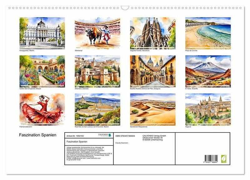 QUALITÄT - Hochwertiger Fotokalender mit 12 wunderschönen Motiven auf lichtbeständigem Bilderdruckpapier, robuste Spiralbindung mit Aufhängebügel.NACHHALTIG - deutliche Abfallreduzierung durch bedarfsgerechte Einzelstückfertigung, umweltfreundliches FSC-zertifiziertes Papier, Produktion in Deutschland, klimabewusste Logistik.PERFEKTES GESCHENK - Kalender für Freunde und Familie, für Kinder und Erwachsene, jung und alt, zu Weihnachten, Geburtstag oder zwischendurch.VIELFALT - Bildkalender in verschiedenen Formaten, z.B. DIN A5, DIN A4, DIN A3 sowie DIN A2. Ob Naturmotiv, Gemälde oder Fotos, ideal für ein persönliches Wohlfühlambiente.Zauberhafte Aquarelle der spanischen Tradition, Natur und Architektur von Autor(in): Claudia Kleemann