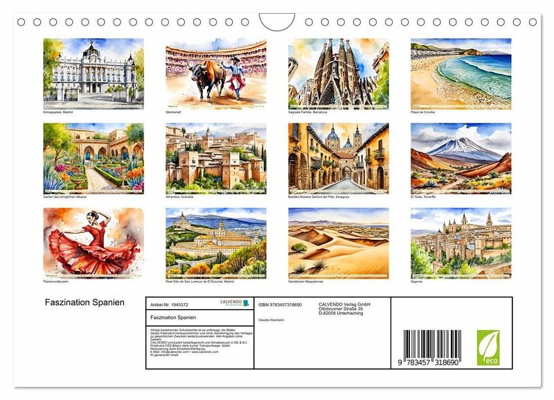 QUALITÄT - Hochwertiger Fotokalender mit 12 wunderschönen Motiven auf lichtbeständigem Bilderdruckpapier, robuste Spiralbindung mit Aufhängebügel.NACHHALTIG - deutliche Abfallreduzierung durch bedarfsgerechte Einzelstückfertigung, umweltfreundliches FSC-zertifiziertes Papier, Produktion in Deutschland, klimabewusste Logistik.PERFEKTES GESCHENK - Kalender für Freunde und Familie, für Kinder und Erwachsene, jung und alt, zu Weihnachten, Geburtstag oder zwischendurch.VIELFALT - Bildkalender in verschiedenen Formaten, z.B. DIN A5, DIN A4, DIN A3 sowie DIN A2. Ob Naturmotiv, Gemälde oder Fotos, ideal für ein persönliches Wohlfühlambiente.Zauberhafte Aquarelle der spanischen Tradition, Natur und Architektur von Autor(in): Claudia Kleemann