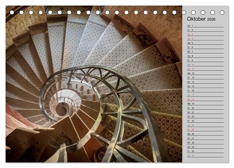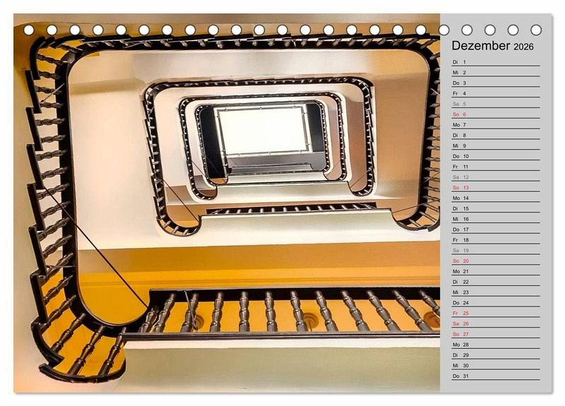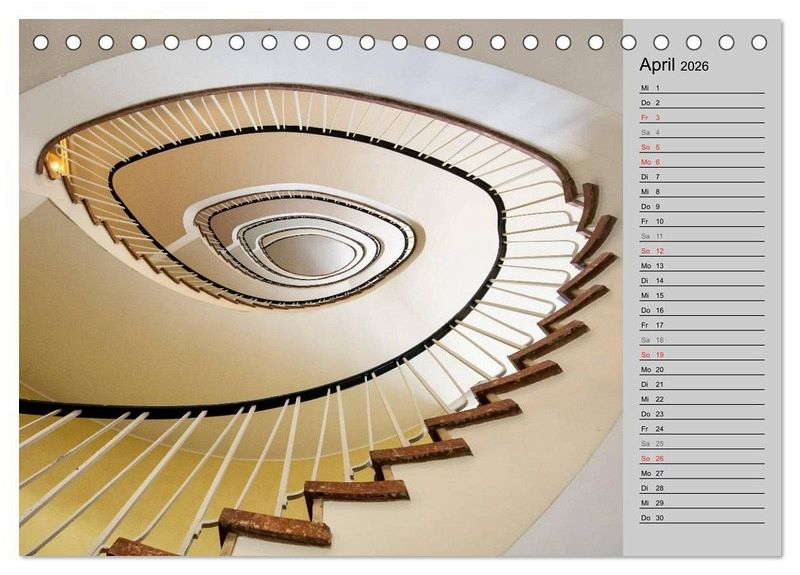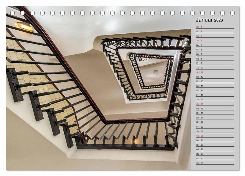 Spindeltreppen, Bogentreppen, Wendeltreppen, Winkelpodestreppen... Es gibt unzählige Arten und Bauweisen von Treppen, doch manche ziehen den Betrachter auf eine besondere Weise in ihren Bann. Sie finden sich in alten Schlössern, Kontorhäusern aus dem 19. und 20. Jahrhundert, modernen Geschäftshäusern und Bürogebäuden. Erfreuen Sie sich jeden Monat an einem dieser besonderen architektonischen Kunstwerke. Mit Planerfunktion - so haben Sie alle Ihre Termine fest im Griff.