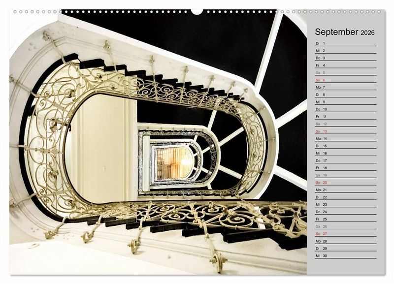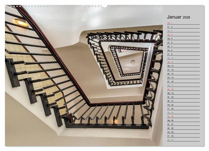 Spindeltreppen, Bogentreppen, Wendeltreppen, Winkelpodestreppen... Es gibt unzählige Arten und Bauweisen von Treppen, doch manche ziehen den Betrachter auf eine besondere Weise in ihren Bann. Sie finden sich in alten Schlössern, Kontorhäusern aus dem 19. und 20. Jahrhundert, modernen Geschäftshäusern und Bürogebäuden. Erfreuen Sie sich jeden Monat an einem dieser besonderen architektonischen Kunstwerke. Mit Planerfunktion - so haben Sie alle Ihre Termine fest im Griff.