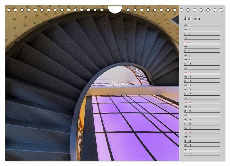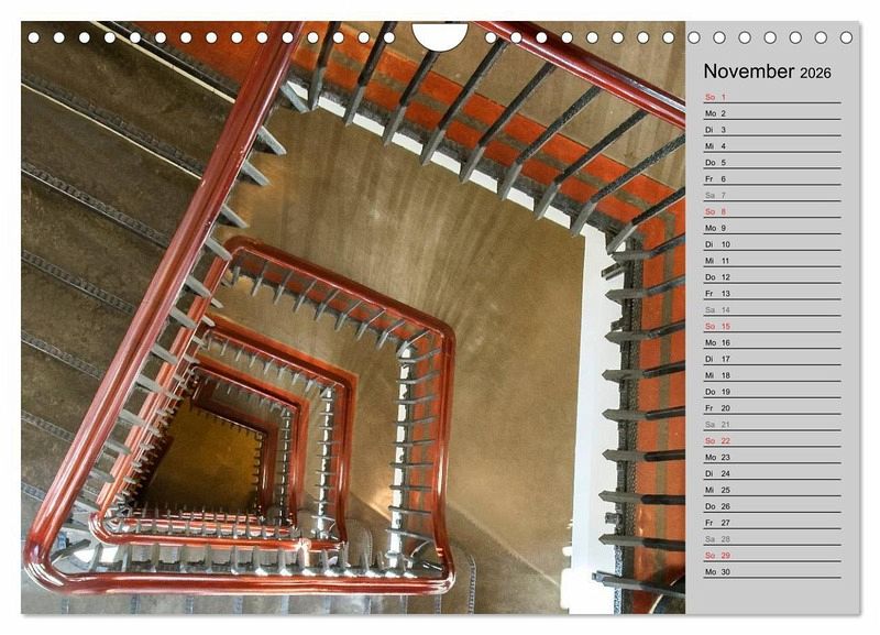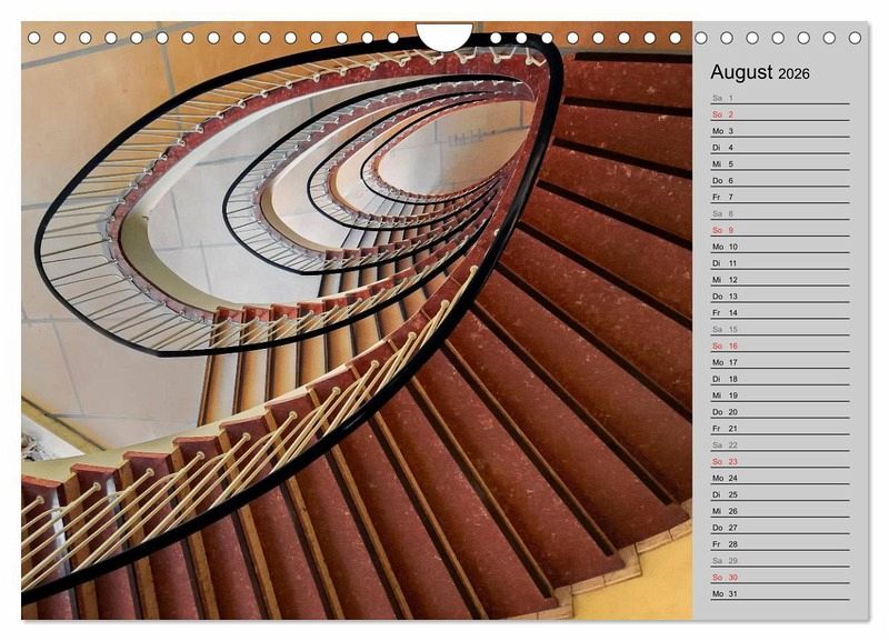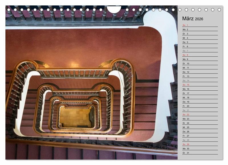 Spindeltreppen, Bogentreppen, Wendeltreppen, Winkelpodestreppen... Es gibt unzählige Arten und Bauweisen von Treppen, doch manche ziehen den Betrachter auf eine besondere Weise in ihren Bann. Sie finden sich in alten Schlössern, Kontorhäusern aus dem 19. und 20. Jahrhundert, modernen Geschäftshäusern und Bürogebäuden. Erfreuen Sie sich jeden Monat an einem dieser besonderen architektonischen Kunstwerke. Mit Planerfunktion - so haben Sie alle Ihre Termine fest im Griff.