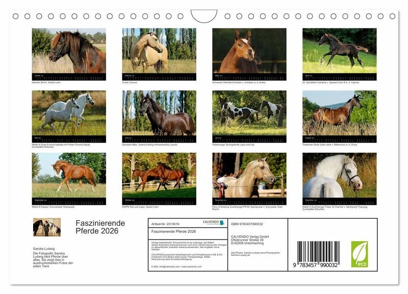 Pferde sind großartige, edle und kluge Mitgeschöpfe. Die Fotografin Sandra Ludwig hat für diesen Kalender sechzehn schöne Pferden verschiedener Rassen meisterhaft in Szene gesetzt.