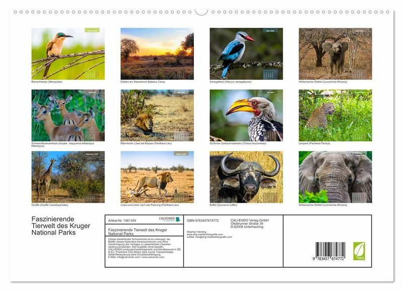 PREMIUM-LINIE - Brillanter Fotokalender mit 12 wunderschönen Motiven, Kunstdruck in Hochglanz in Museumsqualität.QUALITÄT - edle Materialien, stabile Rückwand mit 2 innovativen Einstecktaschen für eine optimale Präsentation an der Wand.NACHHALTIG - deutliche Abfallreduzierung durch bedarfsgerechte Einzelstückfertigung, umweltfreundliches FSC-zertifiziertes Papier, Produktion in Deutschland, klimabewusste Logistik.PERFEKTES GESCHENK - Kalender für Freunde und Familie, für Kinder und Erwachsene, jung und alt, zu Weihnachten, Geburtstag oder zwischendurch.Die unglaubliche Artenvielfalt des Kruger National Parks fasziniert immer wieder! von Autor(in): Stephan Henting