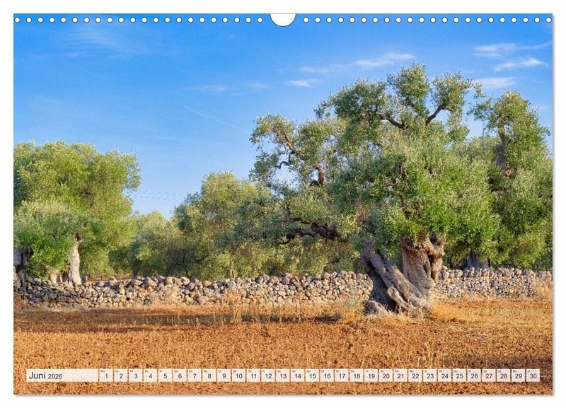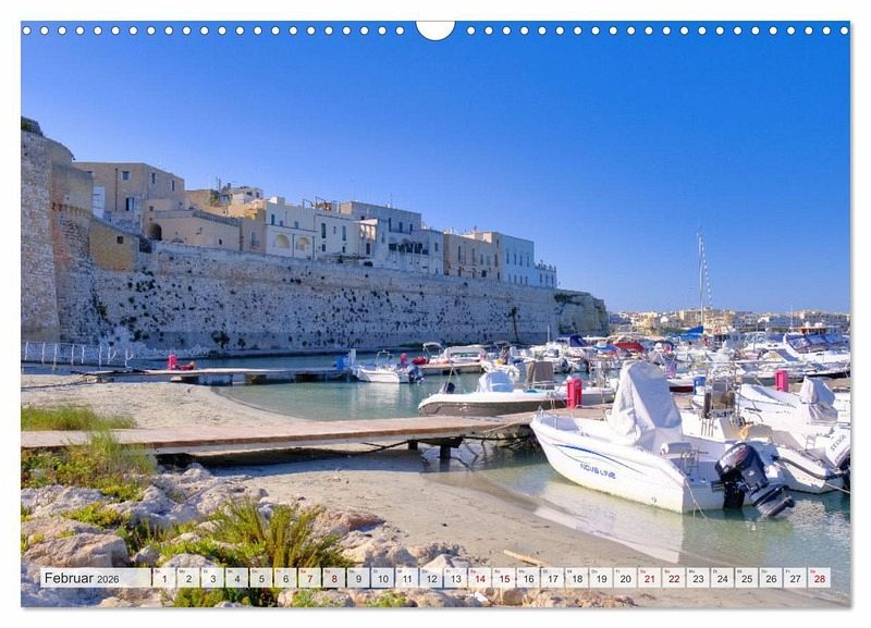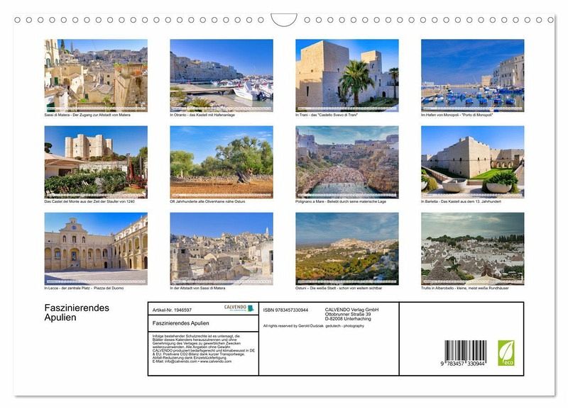 Tauchen Sie ein in die Schönheit Apuliens! Jeder Monat bringt Sie an einen neuen, atemberaubenden Ort dieser charmanten italienischen Region. Lassen Sie sich von der Vielfalt und dem Zauber Apuliens begeistern. Apulien ist der perfekte Ort für einen unvergesslichen Urlaub - ob für Romantiker, Abenteuerlustige oder Kulturinteressierte. Entdecken Sie Apulien, das verborgene Juwel Italiens! Diese atemberaubende Region an der Adriaküste bietet malerische Strände, riesigen Olivenhaine, wunderschöne Orte und Hafenstädte mit viel Historie und Kultur. Holen Sie sich ein Stück Apulien nach Hause und lassen Sie sich Monat für Monat inspirieren! Ideal als Geschenk oder für Ihre eigene Wand - Apulien wartet auf Sie!