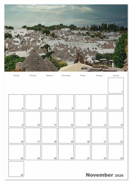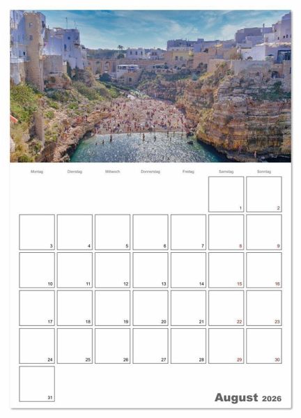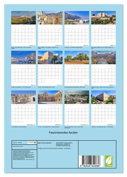 Tauchen Sie ein in die Schönheit Apuliens! Jeder Monat bringt Sie an einen neuen, atemberaubenden Ort dieser charmanten italienischen Region. Lassen Sie sich von der Vielfalt und dem Zauber Apuliens begeistern. Apulien ist der perfekte Ort für einen unvergesslichen Urlaub - ob für Romantiker, Abenteuerlustige oder Kulturinteressierte. Entdecken Sie Apulien, das verborgene Juwel Italiens! Diese atemberaubende Region an der Adriaküste bietet malerische Strände, riesigen Olivenhaine, wunderschöne Orte und Hafenstädte mit viel Historie und Kultur. Holen Sie sich ein Stück Apulien nach Hause und lassen Sie sich Monat für Monat inspirieren! Ideal als Geschenk oder für Ihre eigene Wand - Apulien wartet auf Sie!