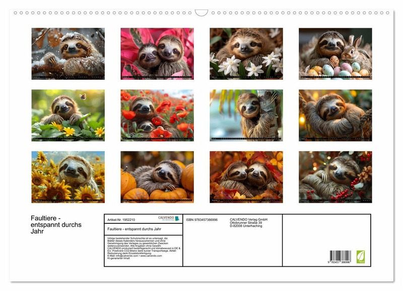 Lassen Sie sich von der Gemütlichkeit und Ruhe unserer bezaubernden Faultier-Motive inspirieren, die mit KI-generierten Szenen passend für jeden Monat liebevoll zusammengestellt wurden.