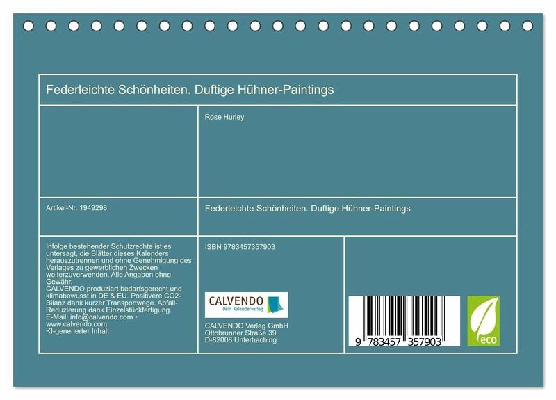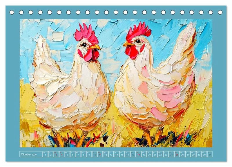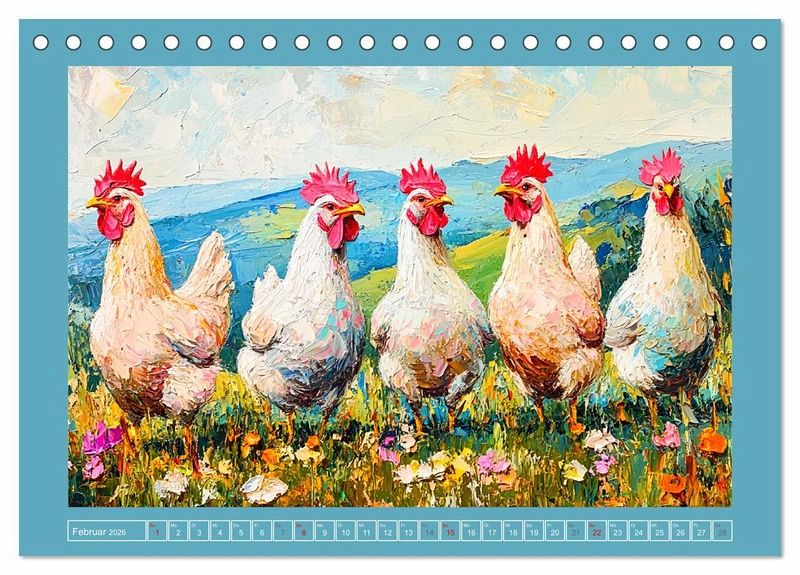 QUALITÄT - Hochwertiger Fotokalender mit 12 wunderschönen Motiven auf lichtbeständigem Bilderdruckpapier, robuste Spiralbindung.NACHHALTIG - deutliche Abfallreduzierung durch bedarfsgerechte Einzelstückfertigung, umweltfreundliches FSC-zertifiziertes Papier, Produktion in Deutschland, klimabewusste Logistik.PERFEKTES GESCHENK - Kalender für Freunde und Familie, für Kinder und Erwachsene, jung und alt, zu Weihnachten, Geburtstag oder zwischendurch.VIELFALT - Bildkalender in verschiedenen Formaten, z.B. DIN A5, DIN A4, DIN A3 sowie DIN A2. Ob Naturmotiv, Gemälde oder Fotos, ideal für ein persönliches Wohlfühlambiente.Charmantes und buntes Federvieh im Ölgemälde-Stil von Autor(in): Rose Hurley