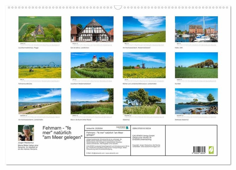 Das alte slawische Wort für Fehmarn ist "fe mer" und bedeutet so viel wie "am Meer gelegen". Die Lage direkt am Meer und ca. 2200 Sonnenstunden im Jahr machen Fehmarn zu einem idealen Ort für Urlaub und Entspannung. In diesem Kalender zeigt Ihnen der Fotograf Jürgen Wackenhut die schönsten Seiten der Insel Fehmarn. Dabei nähert er sich der Insel in respektvoller Haltung, und bringt dies in wunderschönen Bildern zum Ausdruck, die diesem Kalender eine wunderbare Sprache verleihen.