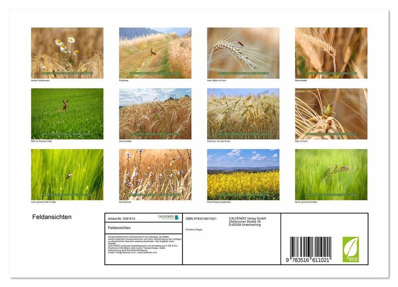Ein Kornfeld ist nicht einfach nur ein von Menschen angelegter Acker. Es ist ist ein Lebensraum für viele Tiere und Insekten. Die Ansichten eines Feldes ändern sich mit jeder Jahres- und Tageszeit. In diesem Kalender sind zwölf wunderschöne Impressionen zum Thema Feld zusammengefasst. Wenn Sie das nächste Mal an einem Korn- Mais- oder Rapsfeld vorbeigehen, achten Sie einmal darauf was es dort alles zu entdecken gibt.