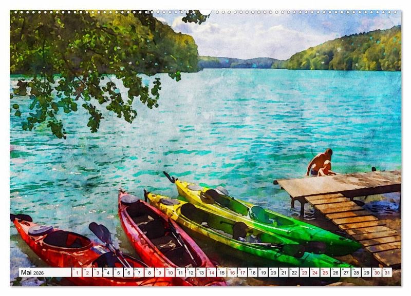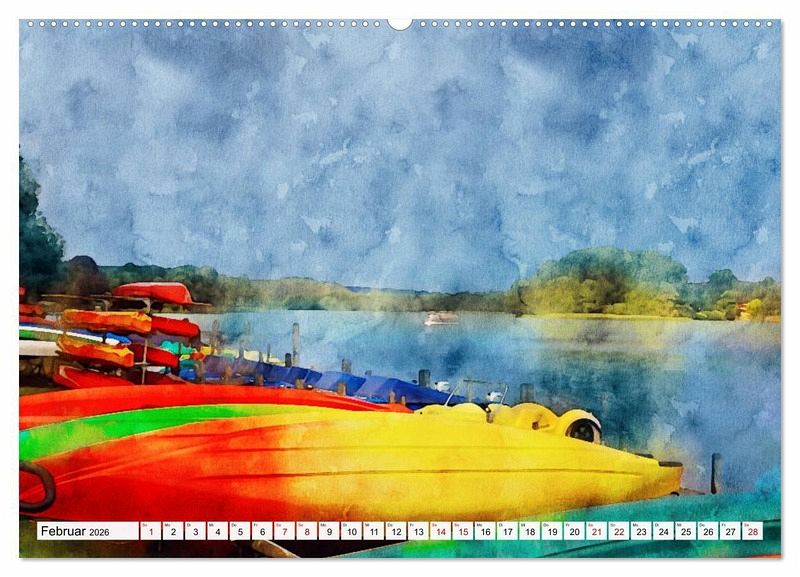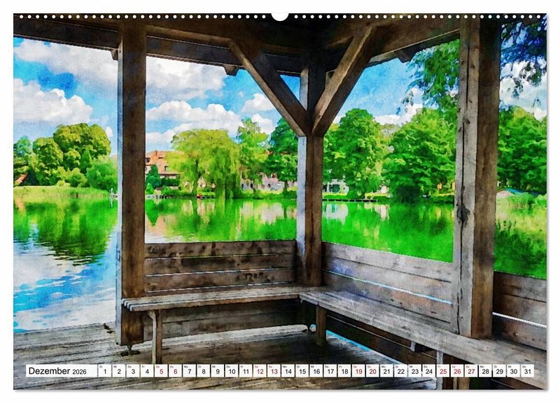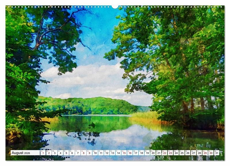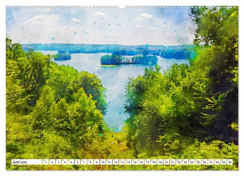 Die Feldberger Seenlandschaft, im Südosten der Mecklenburgischen Seenplatte, läd mit ihren zusammenhängenden Seen zum Bootstourismus ein. In Feldberg wird auch Kur groß geschrieben, so dass Quellen und Kneipp Anlagen für Wanderungen vorhanden sind. Dieser Kalender zeigt einige schöne Ansichten in Aquarell