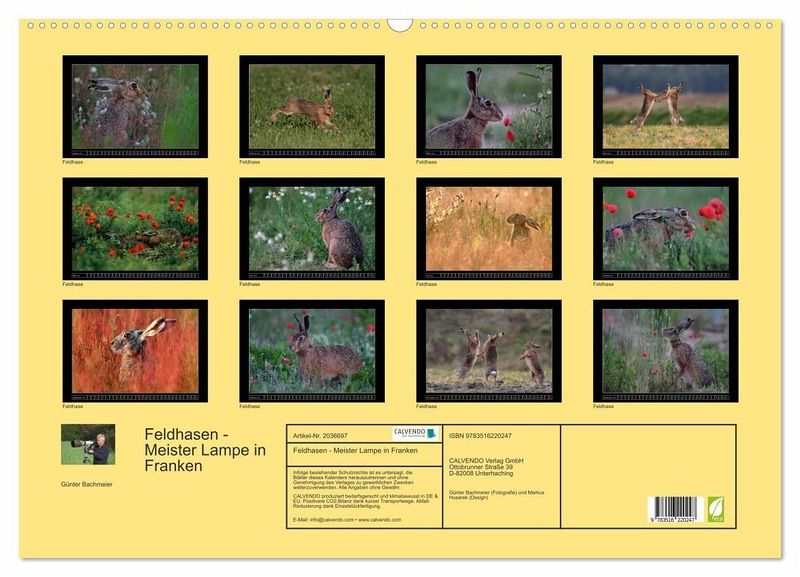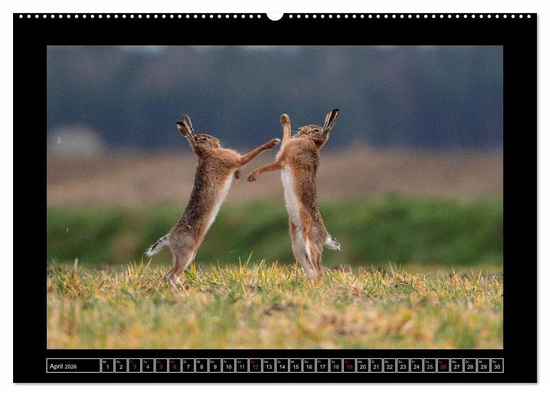 Die Population der Feldhasen ist aufgrund unterschiedlichster Umwelteinflüsse sinkend. Dementsprechend schwierig ist es auch, Meister Lampe in seinem natürlichen Lebensraum "vor die Linse" zu bekommen. Auf 12 Seiten + Cover wurde in diesem Kalender ein breites Spektrum an Naturereignissen abgebildet. Von idyllisch anmutenden Momenten im Feld bis zur wilden "Hatz" durch die Stoppelfelder und dem Boxkampf während der Paarungszeit.