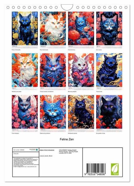 QUALITY - High-quality photo calendar with 12 beautiful images on light-resistant paper, robust spiral binding with hanger.SUSTAINABLE - Significant waste reduction due to print-on-demand production, environmentally friendly FSC-certified paper, produced in the UK, climate-conscious logistical processes.PERFECT GIFT - calendars for friends and family, for children, all ages and all occasions, from Christmasto birthdays and everything in between.LOTS OF CHOICE - Wall calendars in different sizes (DIN A4 and DIN A3), for any topic and personal taste, featuring photography, painting and illustrations.Immerse yourself in the serene beauty of Feline Zen a captivating Japanese inspired cat calendar adorned with delicate flowers and feline companions., author: JBJart