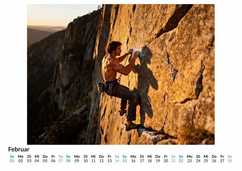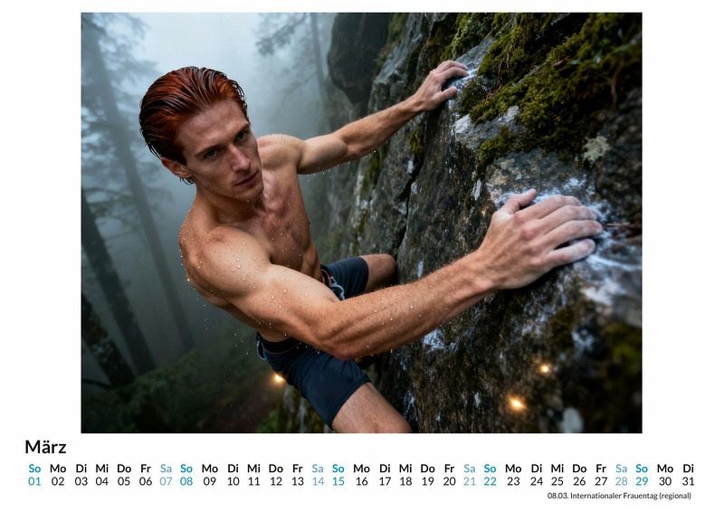 An der Grenze der Schwerkraft, wo Muskelkraft und Willensstärke auf rauen Stein treffen, entfaltet sich eine besondere Ästhetik. Der Kalender "Felsenfeste Kletterer" fängt genau diese Momente ein. Zwölf Monate lang begleiten eindrucksvolle Darstellungen von Athleten ihre Betrachter. Konzentriert auf das Wesentliche, zeigen die Bilder die reine Physis und Entschlossenheit beim Klettern. Dieser Kalender ist eine passende Wahl: Für Liebhaber des Klettersports und der alpinen Welt. Für alle, die eine ästhetische Darstellung des männlichen Körpers schätzen. Für jene, die einen unkonventionellen und kraftvollen Wandschmuck suchen. Jeder Monat präsentiert eine neue Szene: muskulöse Rücken, die sich an Felsvorsprüngen entlangbewegen, Hände, die festen Halt suchen, und Körper, die nur mit einem Klettergurt bekleidet sind. Jedes Motiv ist das Ergebnis einer kreativen Vision, die durch fortschrittliche, computergestützte Bildschöpfung zum Leben erweckt wurde. Die Kompositionen verbinden die rohe Natur des Felsens mit der definierten Form des menschlichen Körpers zu einem harmonischen Gesamtbild. Was der Kalender bietet: Zwölf Monatsmotive mit athletischen Kletterern. Ein Wandkalender im praktischen Format für das ganze Jahr. Ein übersichtliches Kalendarium für Termine und Notizen. Der Kalender "Felsenfeste Kletterer" ist eine Hommage an Kraft, Ästhetik und den unbändigen Willen, Gipfel zu erreichen. Eine Sammlung von Bildern, die das Jahr über inspiriert und fesselt. Es lohnt sich, einen Blick auf die einzelnen Monatsblätter zu werfen.