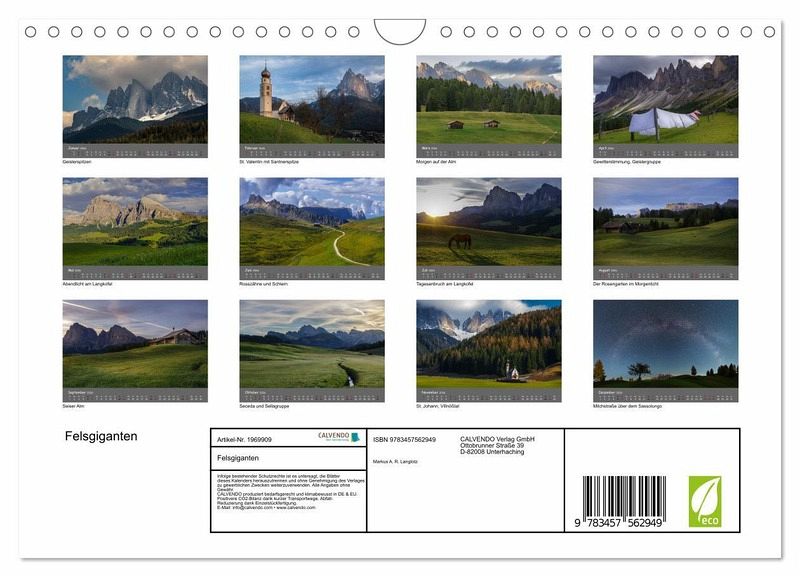 QUALITÄT - Hochwertiger Fotokalender mit 12 wunderschönen Motiven auf lichtbeständigem Bilderdruckpapier, robuste Spiralbindung mit Aufhängebügel.NACHHALTIG - deutliche Abfallreduzierung durch bedarfsgerechte Einzelstückfertigung, umweltfreundliches FSC-zertifiziertes Papier, Produktion in Deutschland, klimabewusste Logistik.PERFEKTES GESCHENK - Kalender für Freunde und Familie, für Kinder und Erwachsene, jung und alt, zu Weihnachten, Geburtstag oder zwischendurch.VIELFALT - Bildkalender in verschiedenen Formaten, z.B. DIN A5, DIN A4, DIN A3 sowie DIN A2. Ob Naturmotiv, Gemälde oder Fotos, ideal für ein persönliches Wohlfühlambiente.Ein photographischer Streifzug durch die Welt der Dolomiten von Autor(in): Markus A. R. Langlotz